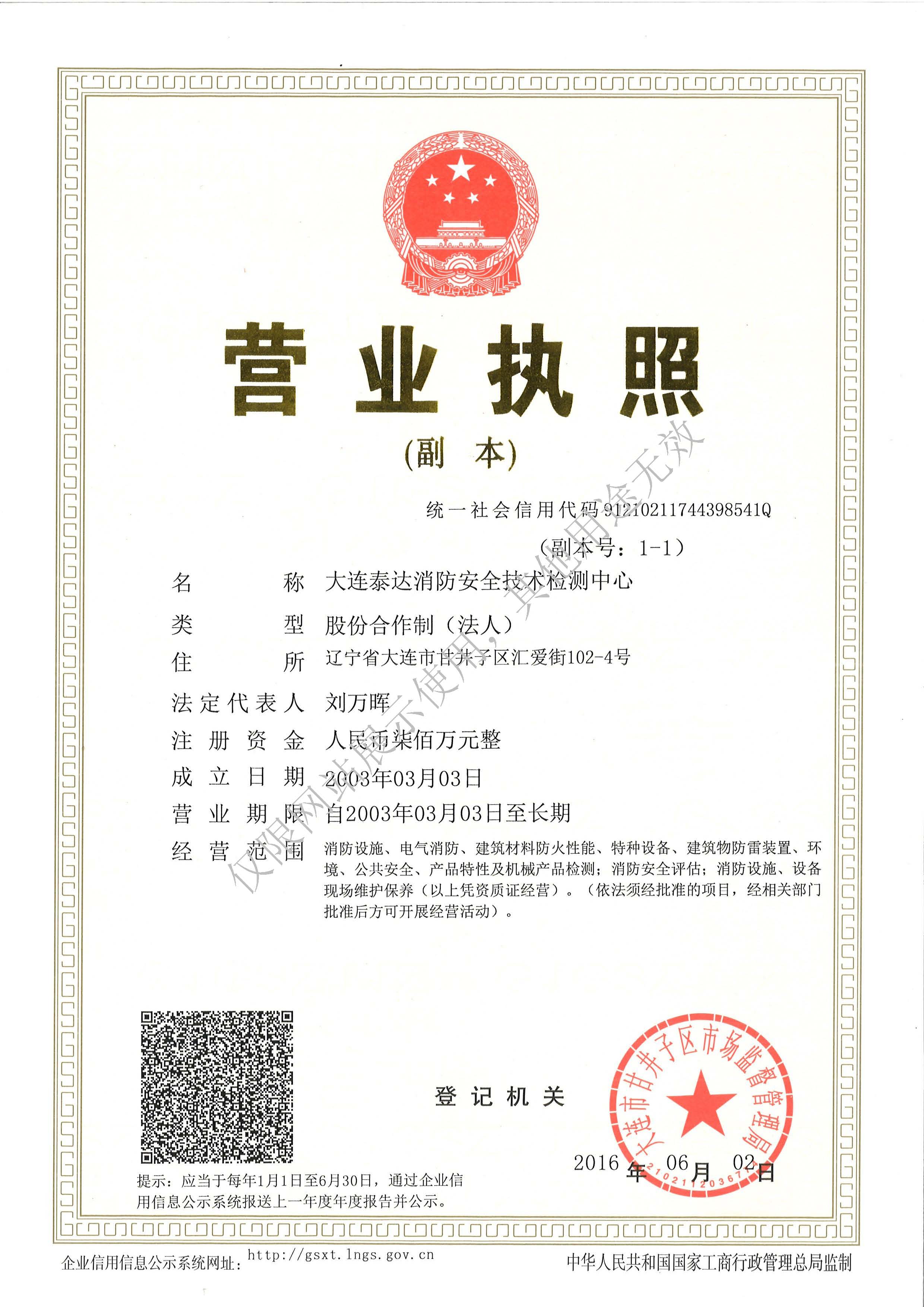 · 是經“社會消防技術服務信息系統”備案并公示的消防技術服務機構,已取得中國氣象局頒發(fā)的雷電防護裝置檢測資質證書、遼寧省質量技術監(jiān)督局審核批準的檢驗檢測機構資質認定證書(CMA)及包括消防檢測、電氣檢測、雷電防護裝置檢測、防火涂層厚度檢測等在內的200余項檢驗檢測能力,取得大連市應急管理局頒發(fā)的安全生產標準化證書,獲得質量管理體系、環(huán)境管理體系、職業(yè)健康安全管理體系認證證書,是經備案的高新技術企業(yè),可獨立出具具有證明作用的檢測報告。